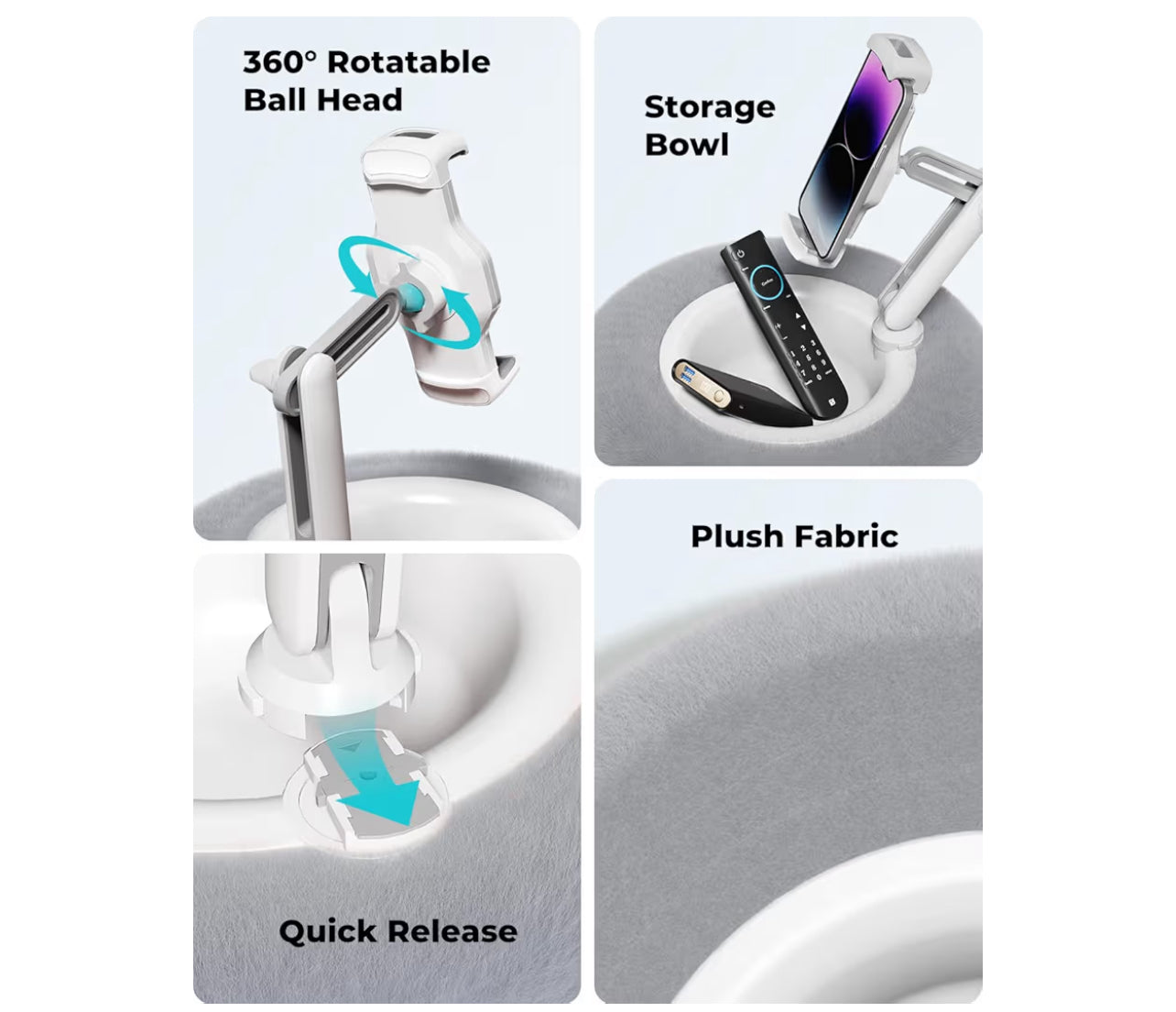 With its 360° rotatable arm, soft cushioned base, and hands-free design, you can watch, read, work, or video call comfortably—anywhere, anytime.